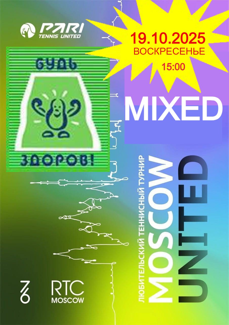 Микст 19 октября БУДЬ ЗДОРОВ. Шестой турнир Moscow United by RTC, Mixed, серия любительских турниров Tennis United, смешанный парный разряд. 19.10.2025 Будь Здоров, начало 15:00. Корты хард зал . Результаты всех участников входят в единый рейтинг серии турниров Tennis United. Организатор турнира: Клуб RTC (Москва), директор турнира Наталья Калачева, главный судья Алексей Полюшкин.