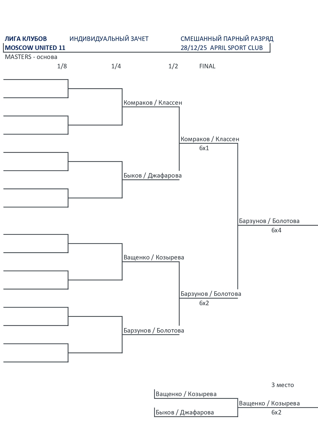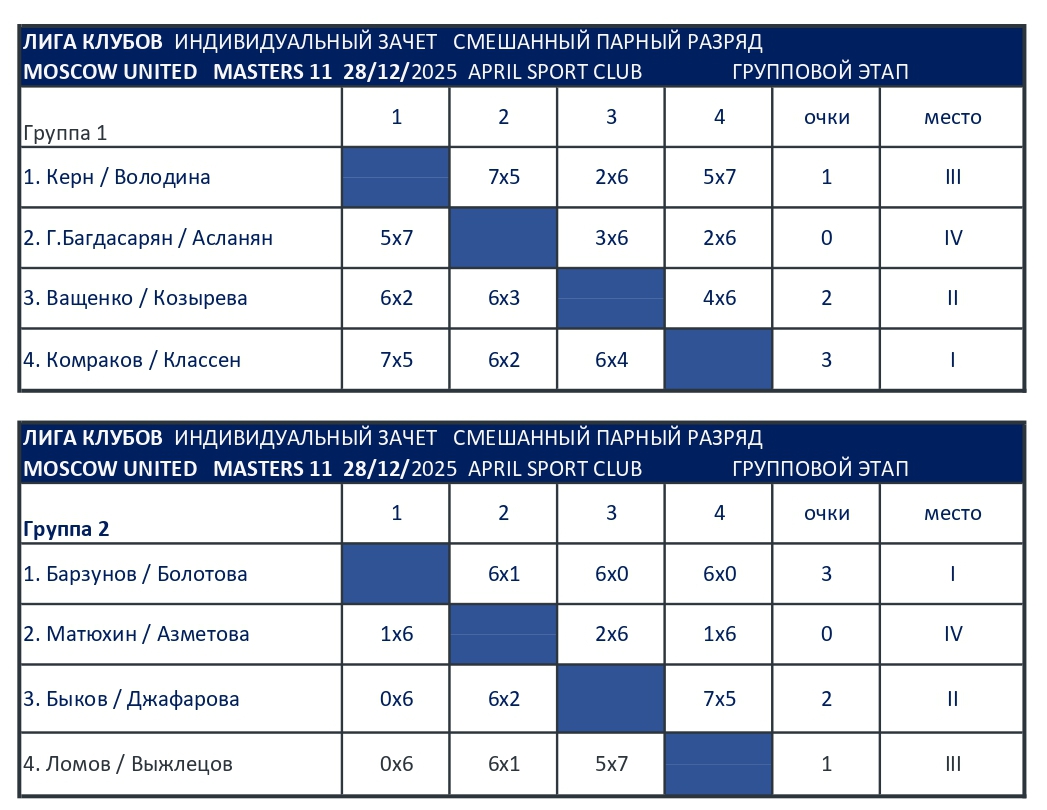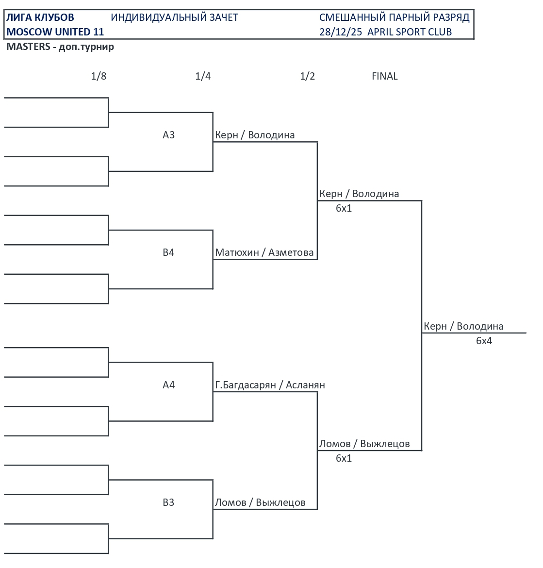 Микст МАСТЕРС (8 пар): групповой этап, основной турнир с 1/2, дополнительный турнир с 1/2.