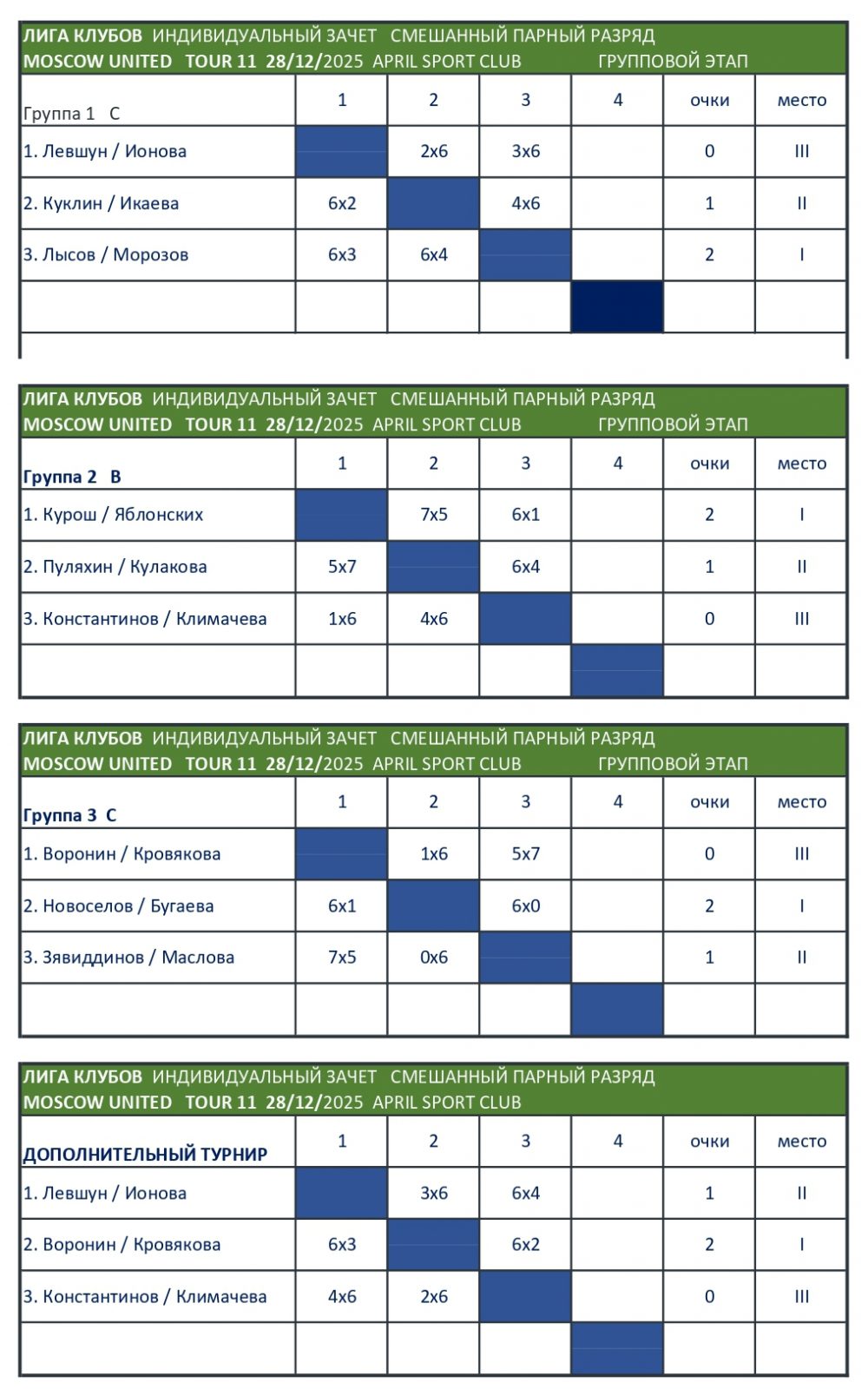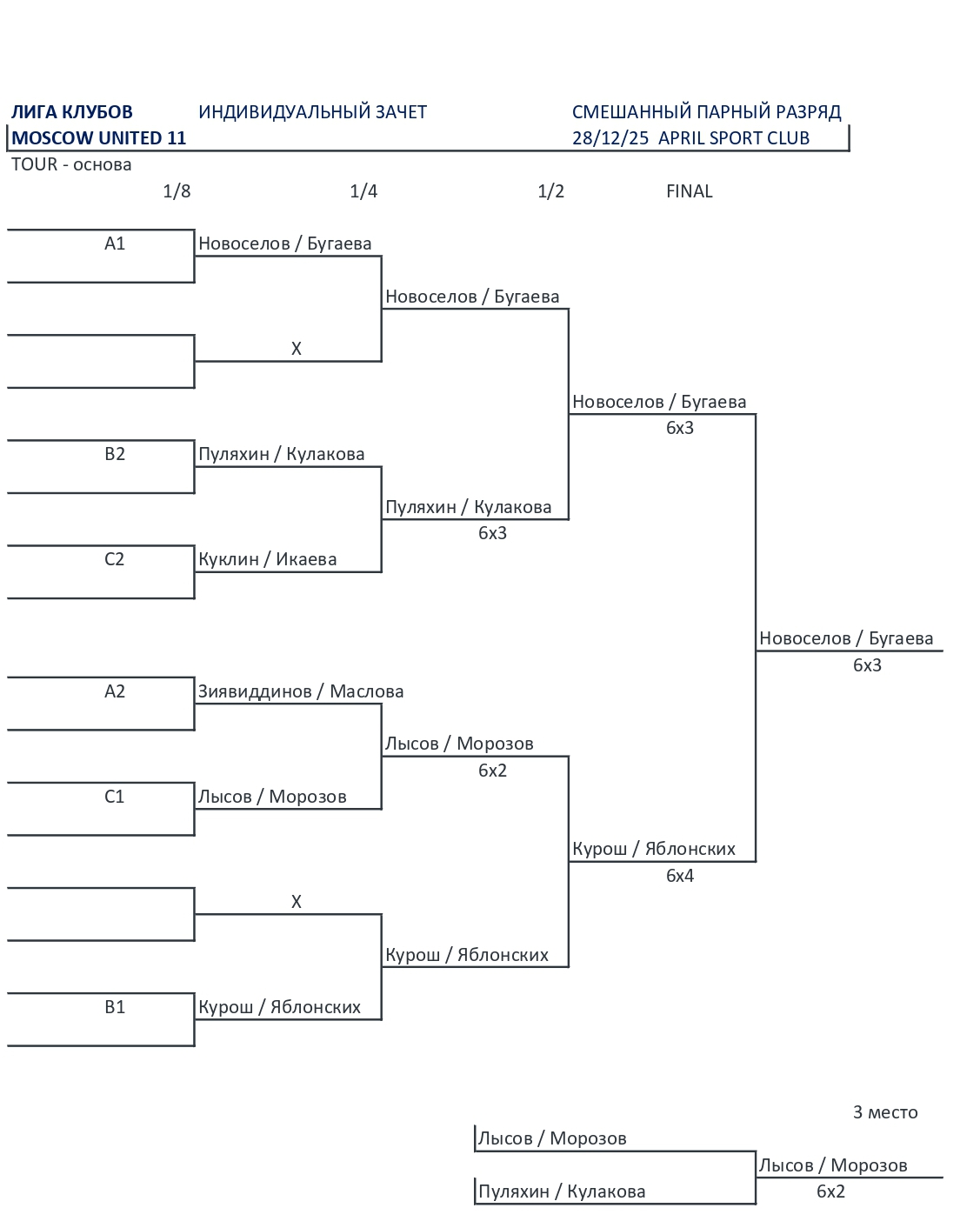 Микст ТУР (9 пар): групповой этап, основной турнир с 1/4, дополнительный турнир (группа).