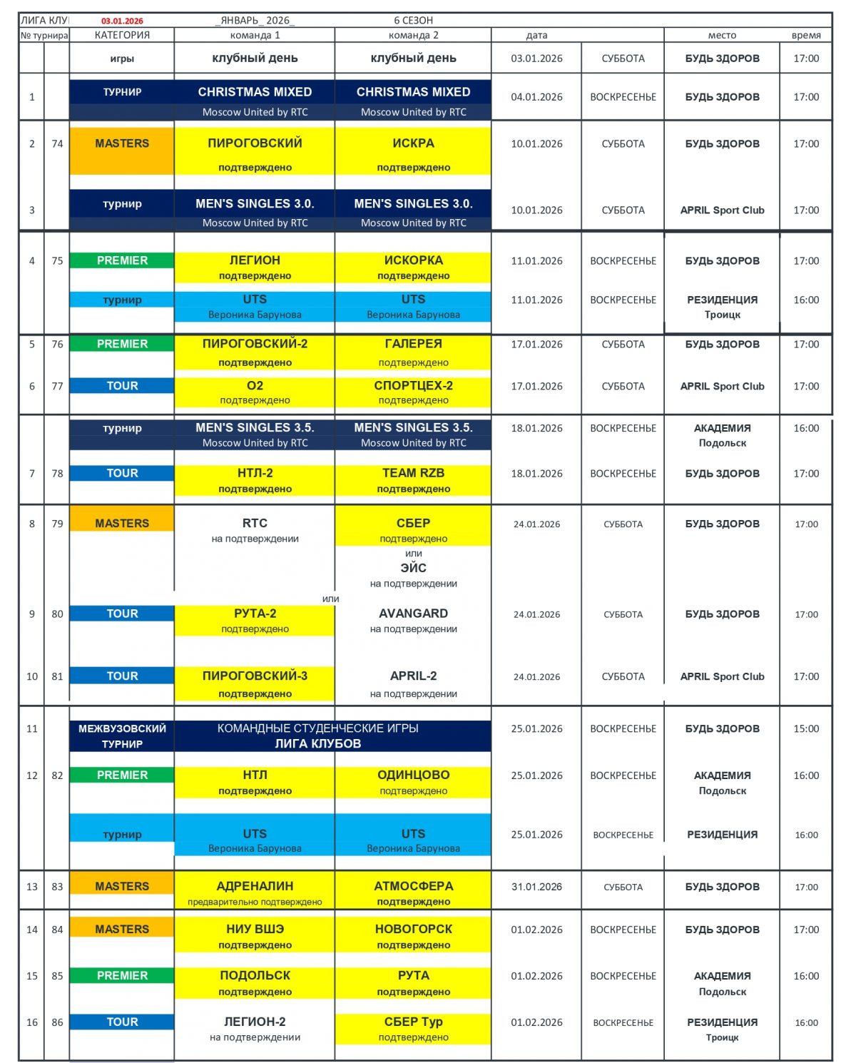 Расписание клубных дней, турниров клуба RТС, расписание командных матчей Лиги Клубов.