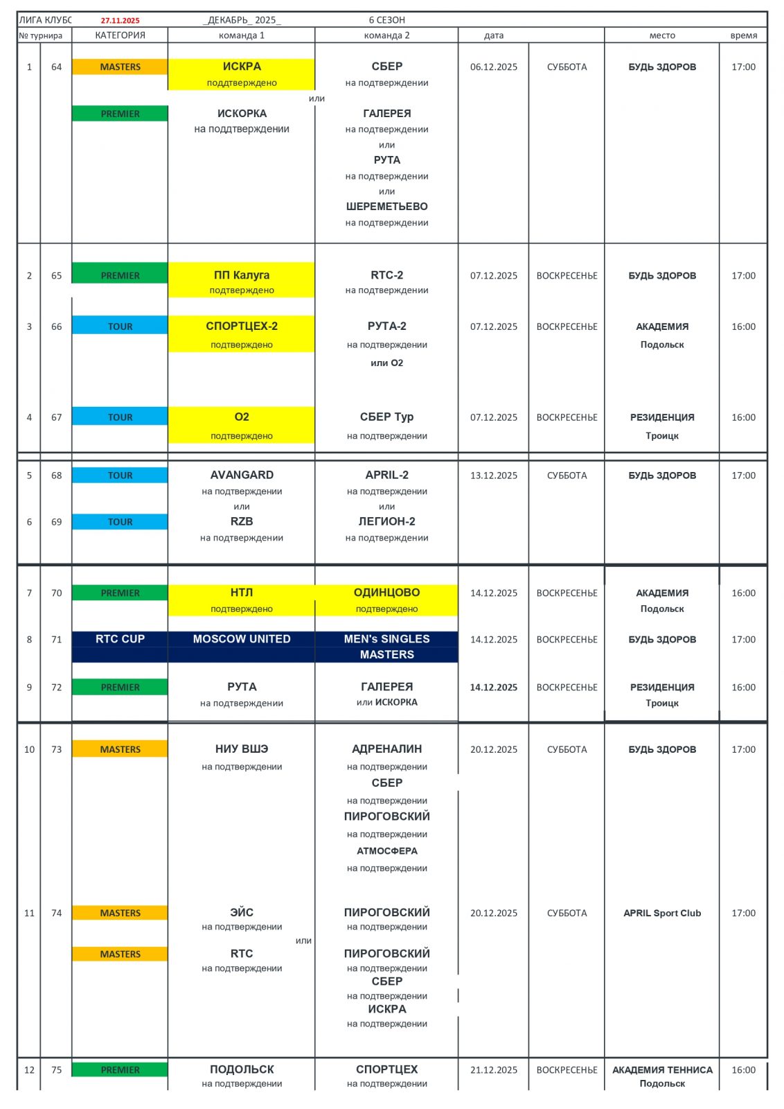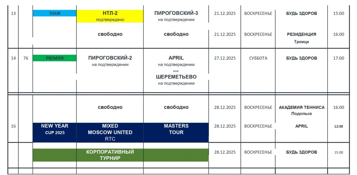 Пятница, 28.11.25 — APRIL, 4 корта грунт улица/ хард зал. 20:00 — 23:00;